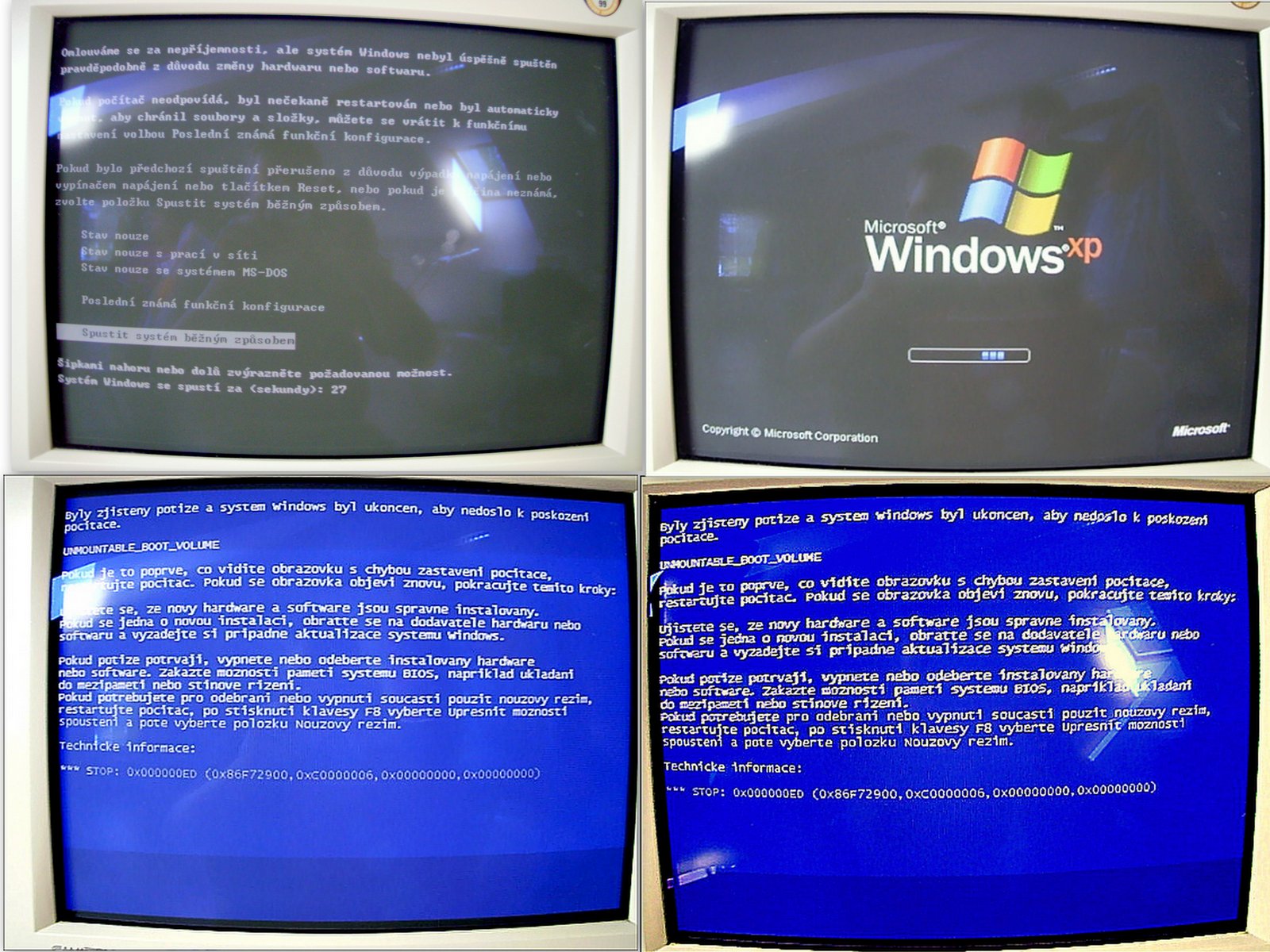 Výběrem možnosti "Spustit systém běžným způsobem" začalo nabíhání systému Windows XP a těsně před zobrazením učt,ů se na vteřinu zobrazila modrá smrt(viz FOTO) a pak znovu: Omlouváme se za ....