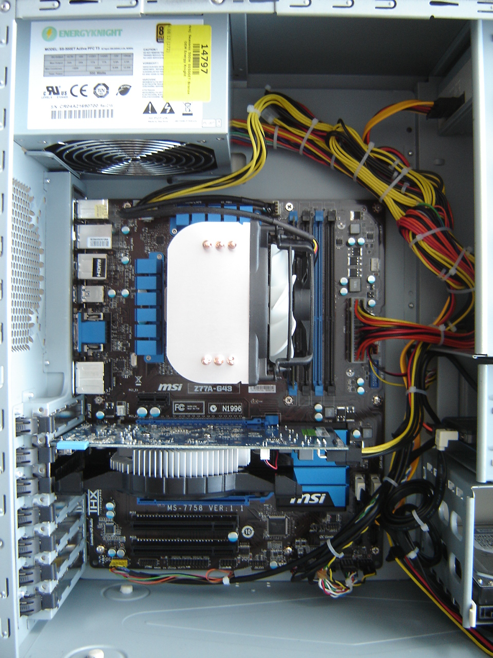 Pokud neatakuješ první cenu na výstavě počítačových kabeláží, tak to máš dobrý. Na tvým místě bych přestal řešit gábly a začal hledat větrák na zadní stěnu bedny. Takhle musí všechno teplo tahat zdroj a co víc, bude tahat málo, protože bude přisávat falešnej luft tím místem, kde ti chybí ten větrák.