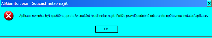Dobrý den, chci se zeptat jak mám zapnout asmonitor.exe???Pokaždý když zapnu pc mi píše že aplikace nemůže být spuštěna, protože součást hk.dll nelze najít. Požíže odstraníte opětovnou instalaci aplikace, Poradí někdo prosím?
