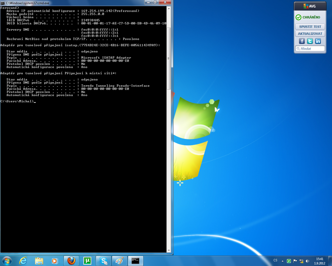 169.254.x.x znamená, že nevidíš na router a nedostáváš od něj ip adresu. proto taky není vyplněna žádná brána.