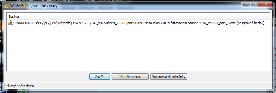 stáhnul jsem si 12 souborů (po vyextrahování z toho měl být jeden soubor.) při extrahování se winrar zasekne ne 99% viz obrázek, potom hodí chybu že nesouhlasí heslo 2. části. viz obrázek. Winrar jsem zkoušel aktualizovat, zkoušel jsem to we 7zipu viz obrázek ale nic.
