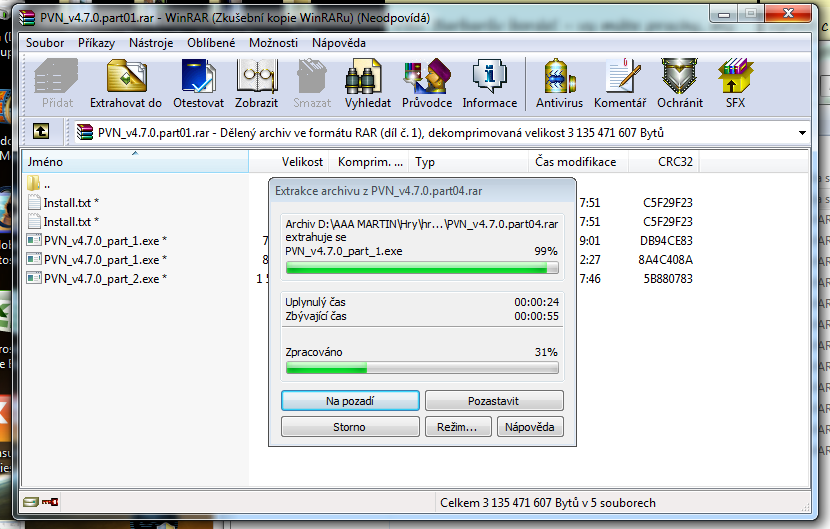 stáhnul jsem si 12 souborů (po vyextrahování z toho měl být jeden soubor.) při extrahování se winrar zasekne ne 99% viz obrázek, potom hodí chybu že nesouhlasí heslo 2. části. viz obrázek. Winrar jsem zkoušel aktualizovat, zkoušel jsem to we 7zipu viz obrázek ale nic.