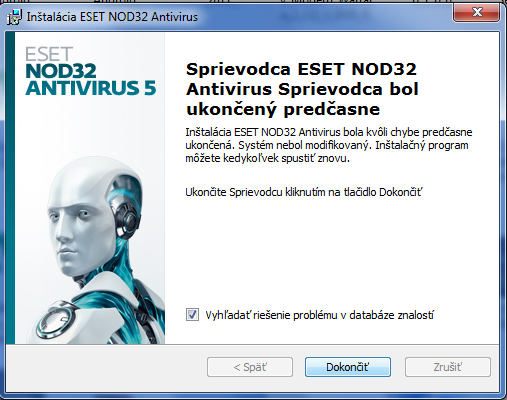 Dobry den mam problem mam notebook lenovo z560 a chcel by som si nan nainstalovat eset nod 32 5 ale problem je ten ze asi v strede instalacie my len napise ze instalacia bola predcastne ukoncena ....vid foto ....uz si neviem pomoct je to orig. verzia stiahnuta zo stranky ESET ...nemam nainstalovanu ziadnu inu verziu pozeral som aj cez eset uninstaller