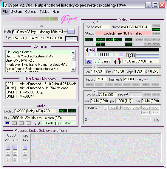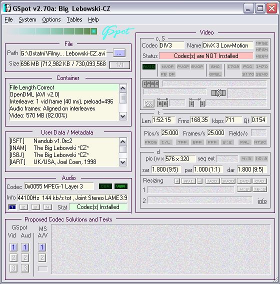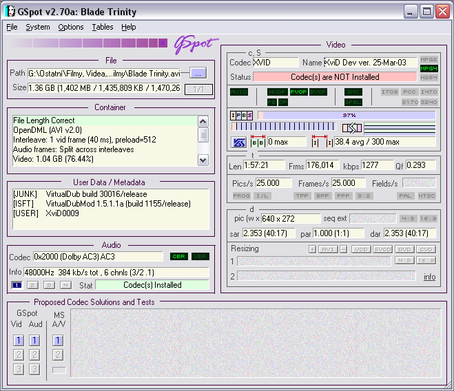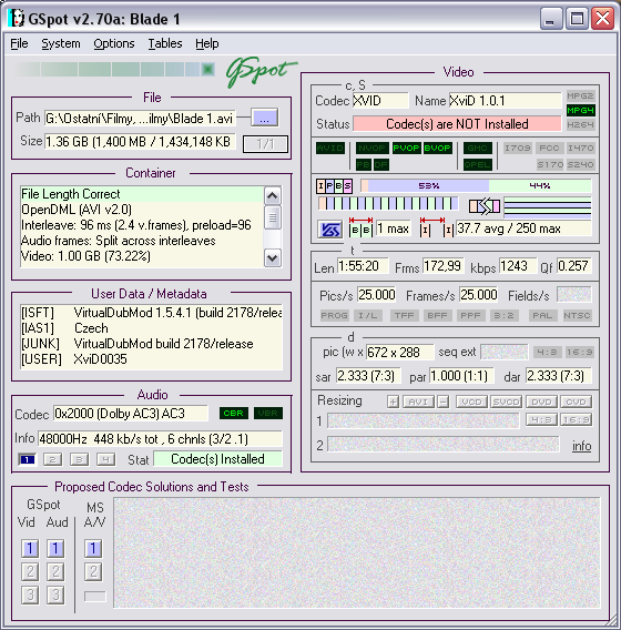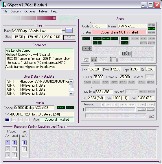 Když jsem v tom FormatFactory dal Video kódování: MPEG4(DivX) a vše octatní nechal na výchozí, tak to na TV běží v pohodě, akorát výsledný soubor je menší než původní. Takhle vypadá funkční Blade 1 v GSPOT.