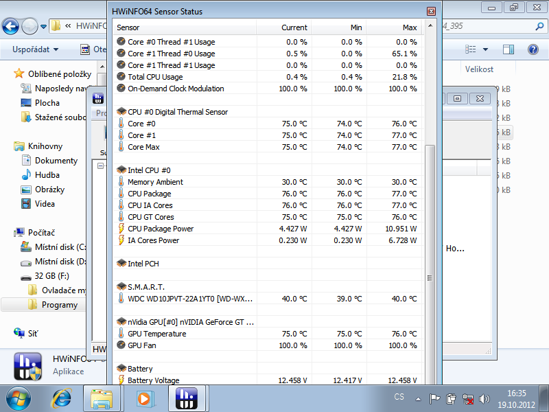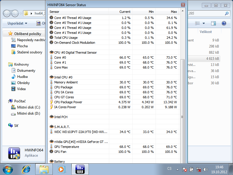 Speedstep? To u toho cpu? Energetický profil myslíš v možnostech napájení - rovnováha? Notebook je po reinstalaci a instalování ovladačů, nic jsem neměnil. Po 20 minutách v klidu to kleslo na 69° ale to je pořád asi hodně.