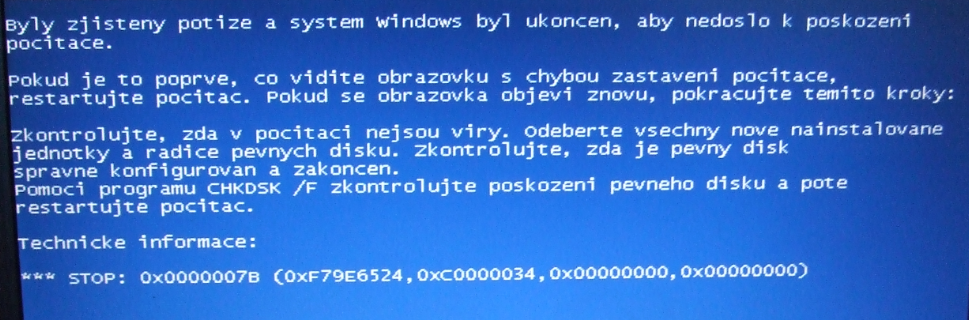 Pak následuje modrá obrazovka viz foto.