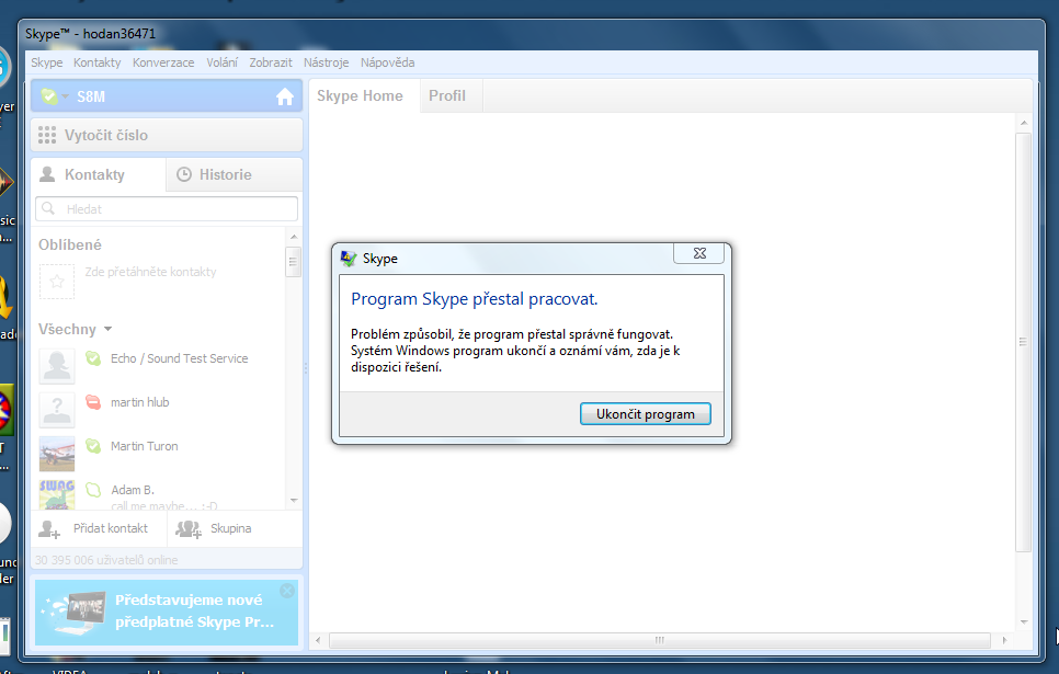 jojo, prostě zapnu skype přihlásím se a šup hned po naběhnutí to napíše že nemůže pokračovat a vypne se, vše ostatní běží úplně v pohodě zkoušel jsme i jiné účty a vůbec se nepřihlásím hned mě to vyhodí tu chybu.