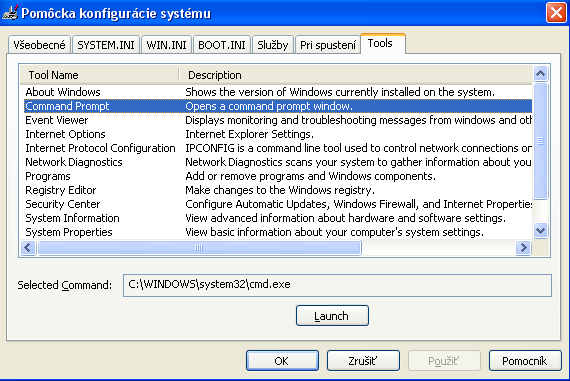 Nemám firemný PC. v msconfig neni cmd ale ak dam tools tak tam mam cmd.exe (fotka)