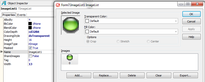 1. Najprv som v komponente TImageList nastavil vlastnosti ColorDepth, DrawingStyle, Width, Height...