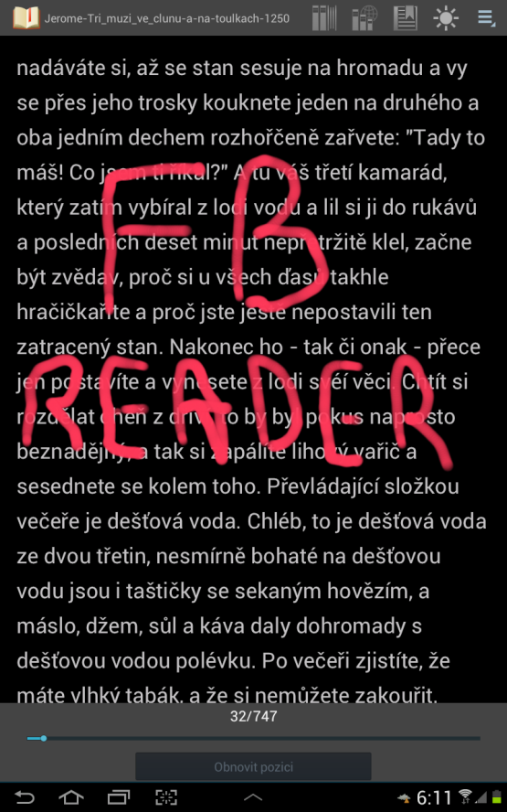 Chce to čtečku FBReader a noční schema. Jednak se dobře čte, nebolí oči, druhak se šetří baterka. Displej nejvíc žere a když je bílý, tak fakt dost.