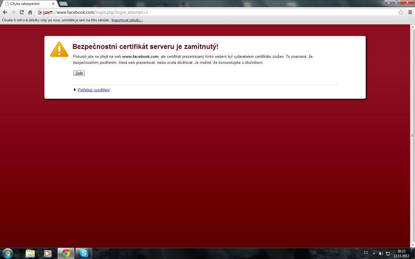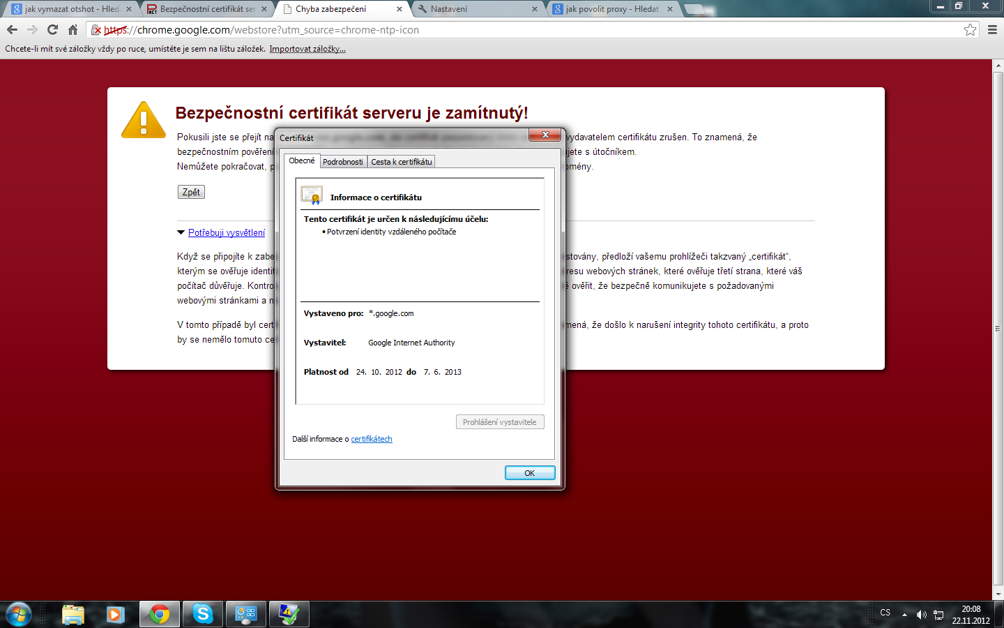 Prosím pomocte mi někdo co mám s tím dělat ... už vážně nevím co začalo to včera mám prohlížeč google chrome když chci najet na www.google.cz píše mi to Bezpečnostní certifikát serveru je zamítnutý! a tak jsem projizdel fora a nasel jsem jenom to ze mam vypamaz cookies a pak reinstal udělal jsem to na nejnovější verzi www.google.cz mi jde .. ale když chci najet třeba do chrome store.. tak to nejde nemohu se přihlásit na Gmail ani na youtube.. používám jiný prohlížeč ale tenhle jsem si oblíbil když kliknu pravým na ten důvod proč tam nemohu píše mi to že identita těchto webových stránek nebyla ověřena to taky nevím co znamená.. , nemá někdo stejný problém ? nebo neví někdo jak to opravit a aby mi zase všechno šlo jako dřív ? prosím .