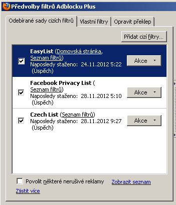 Ještě se chci zeptat jaké filtry v Adblocku používáš? Stačí Fanboy's Adblock List + Fanboy's Czech nebo máš ještě nějaké jiné. Já jsem vypnul Czech List (neudržovaný) a EasyList je údajně skoro totéž co Fanboy's (měl by prý stačit jeden z nich).