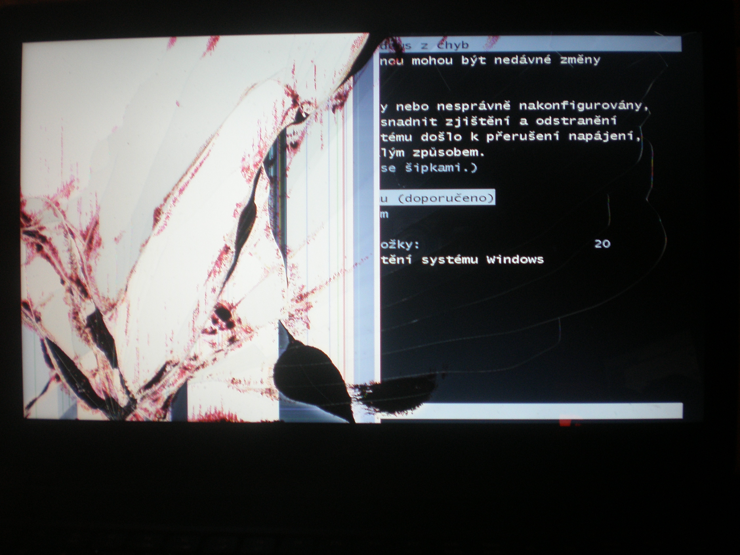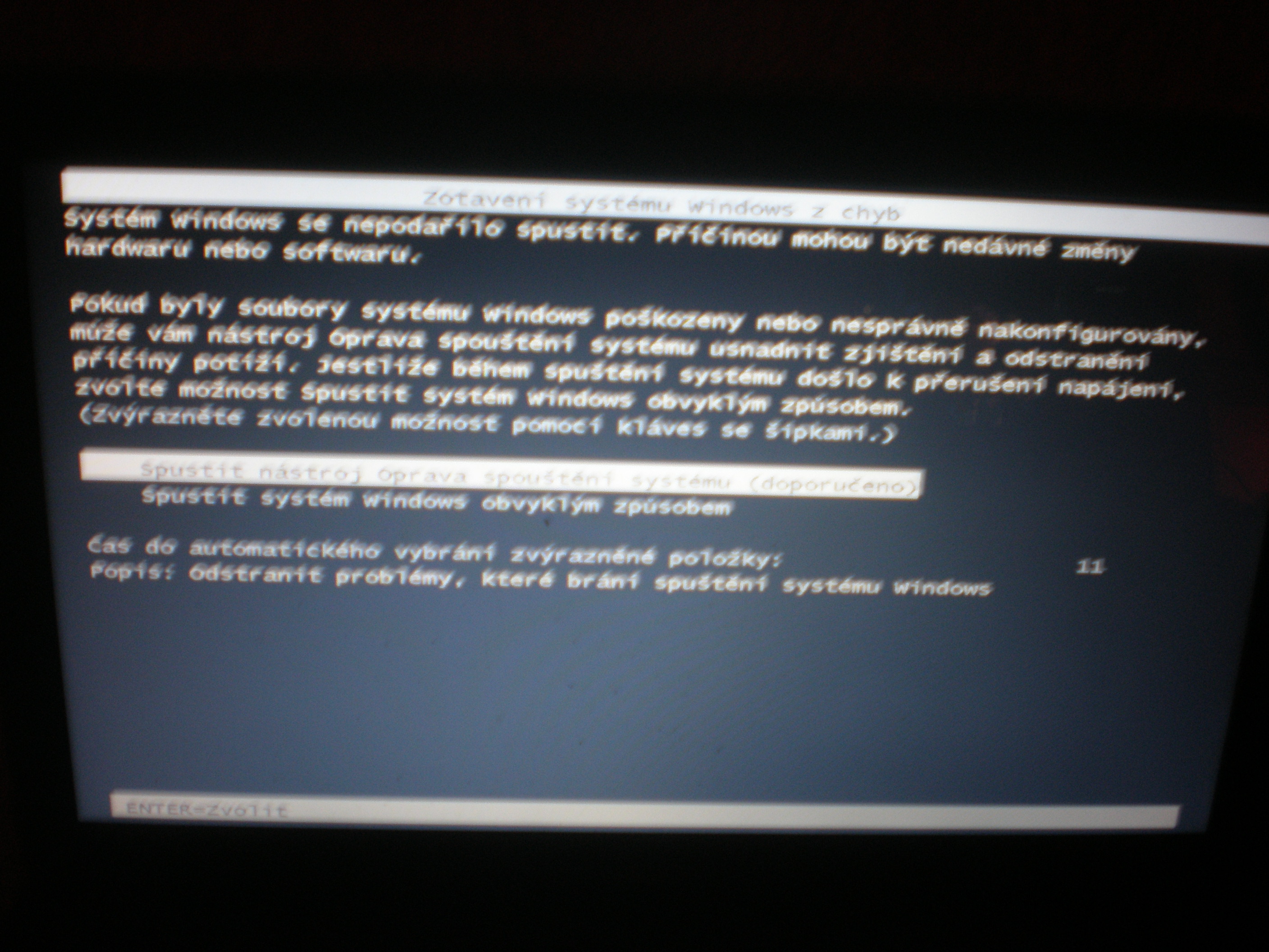 cs, pred chvili me nekdo volal k oknu, a jak jsem spechal tak jsem zavadil o kabel od notesu (nabijecky) a notebook mi spadnul na zem a nabijecka vypadla brutalne rychle ze zasuvky. kdyz jsem notebook zvednul hned po tom, co mi spadnul, vubec nereagoval s okolim. jediny co se mi tam hejbalo byl kurzor mysi, nereagovala ani ikona start, tak jsem to vypnul (primo tlacitkem) a kdyz jsem to zapnul, normalne se to rozjelo pak se mi zobrazilo SPOUSTENI SYSTEMU WINDOWS, a pak se to seklo a nic se nedelo. znova sem to vypnul a ukazalo se mi tam (prilozeny obrazek), zvolil jsem SPUSTIT NASTROJ OPRAVA SPOUSTENI SYSTEMU. pak mi to asi hodinu hledalo potize, a pak to konecne zacalo "opravovat" pocitac. po dvou hodinach jsem to zas vypnul, dospel jsem k nazoru ze uz se to asi nevzpamatuje. tohle jsem delal asi jeste 5x... nic. moc prosim o pomoc, za kazdou pomoc budu rad! PS: mam Windows 7.