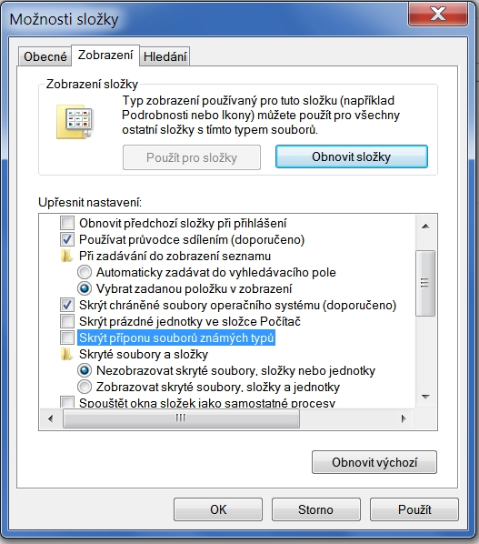 Ve standardním nastavení Windows 7 skrývají přípony některých známých typů souborů, jako jsou kupříkladu soubory s příponami .exe, .jpg či .mp3. Chcete-li ale mít okamžitě jasno, s jakým souborem máte co dělat, pak klepněte v Průzkumníku Windows na tlačítko Uspořádat a poté klepněte na položku Možnosti složky a hledání. V dialogovém okně, které se následně objeví, se pak přesuňte na záložku Zobrazení, a zde odeberte zatržítko před položkou Skrýt příponu souborů známých typů.