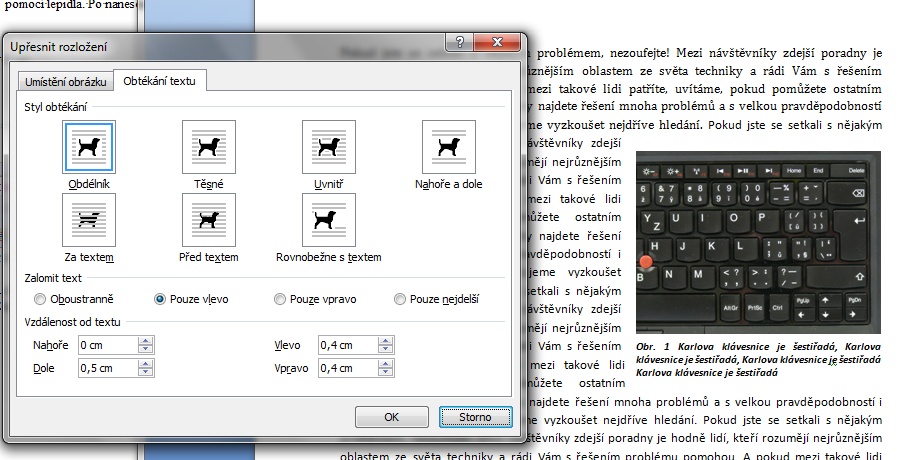 Word 2007: vložím obrázek, klepnu na něj, zvolím Obtékání obrázku, poté Další možnosti rozložení, zvolím Styl obtékání "Obdélník", Zalomit text - "Pouze vlevo", dále nastavím (dle potřeby) Vzdálenost od textu. Nakonec, jak bylo výše poznamenáno, opět klepnu na obrázek pravým myšidlem, zvolím "Vložit titulek".