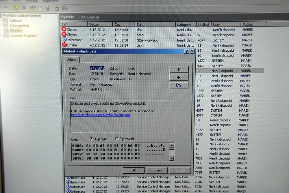 - zkontrolovat Prohlížeč událostí - chyby viz. screen
