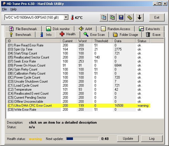 Jedinou podezřelou věc, co jsem zjistil, velký počet chyb v přenosech Ultra DMA (viz. screen HD Tune)