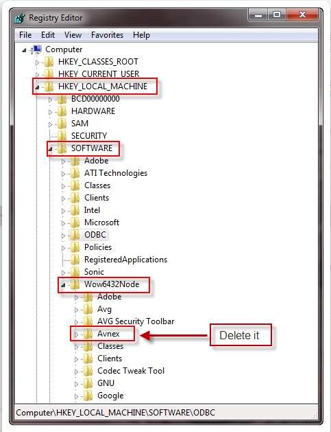 Run >> regedit >> Go to HKEY_LOCAL_MECHINE >> Software >> Find Avnex and delete it >> Next, go to HKEY_CURRENT_USER>> Software >> Find Avnex and delete it.