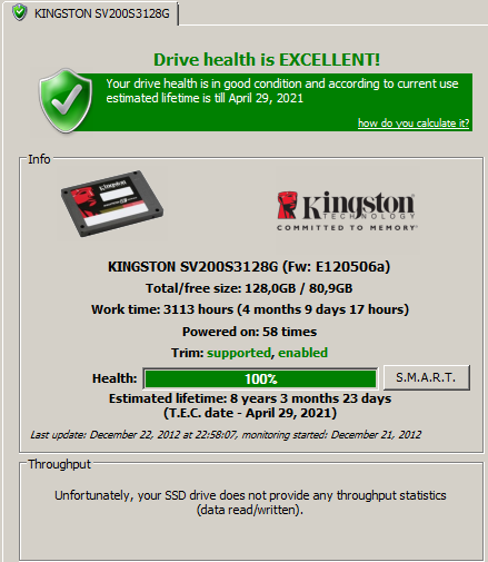 Ad množství zapsaných dat: Průměrný počet přepisů disku za měsíc máš cca 1,1. Když vezmu v potaz, že životnost těchto MLC pamětí je udávána kolem 5000 přepisů, Tvůj současný způsob užívání odpovídá cca 13,2 přepisům SSD za rok. Kolik tak asi v tomto případě zbývá... :)