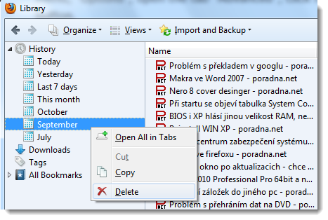 Dobry den, prosim o radu. Chtela bych si vymazat historii vsech ulozenych souboru a webovych stranek za posledni rok. Jak to udelam aby se mi cela historie smazala? Staci pres nastroje-smazani historie? Nebo se v tomto pripafe smaze pouze dnesni historie prohlizenych webovych stranek? Predem moc dekuju za odpoved.