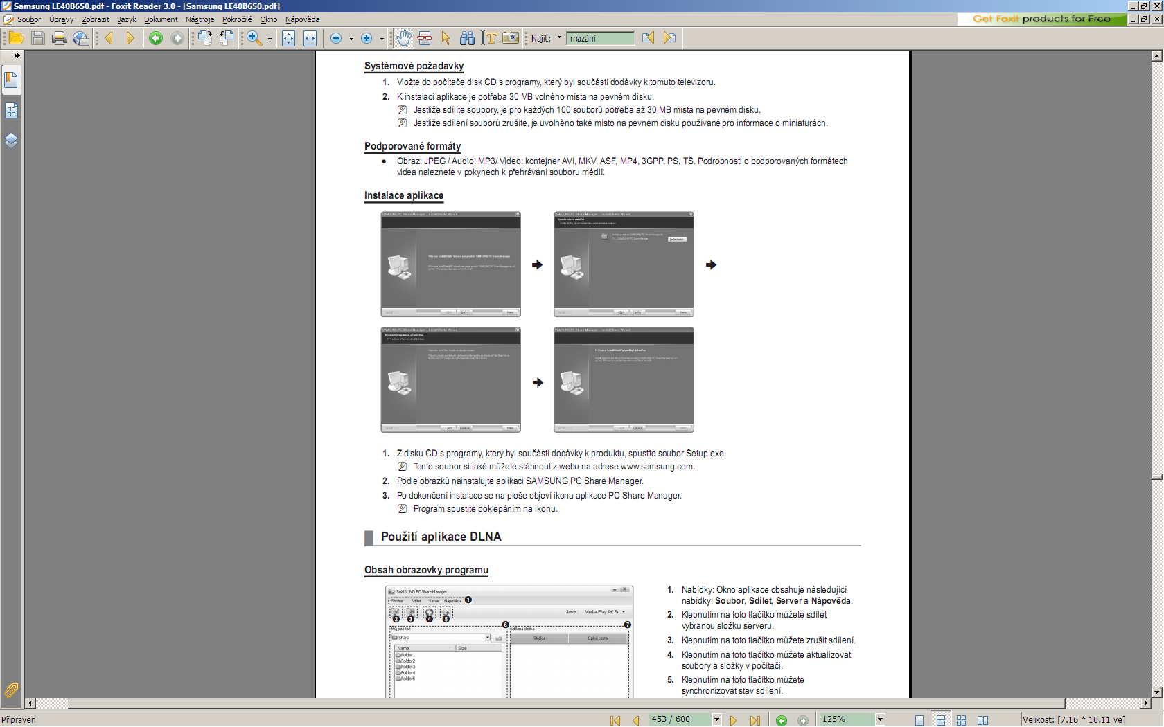 For lesov: Tak můj manuál v pdf má 660 stran (v 10-ti jazykových verzích). Na straně 453/680,kterou jsi mi poslal mám úplně něco jiného. V celém manuálu není o Share manager ani zmínka a CD jsem k televizi také nedostal (koupě-srpen 2009).