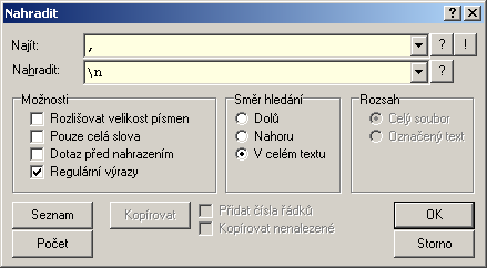 Co nahradit hromadne carku zalomenim radku (enter)?