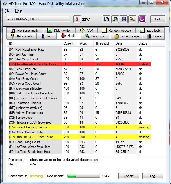 Zatím přemapován jeden sektor > tato hodnota může zůstat, nebo narůstat > každopádně takový disk se…