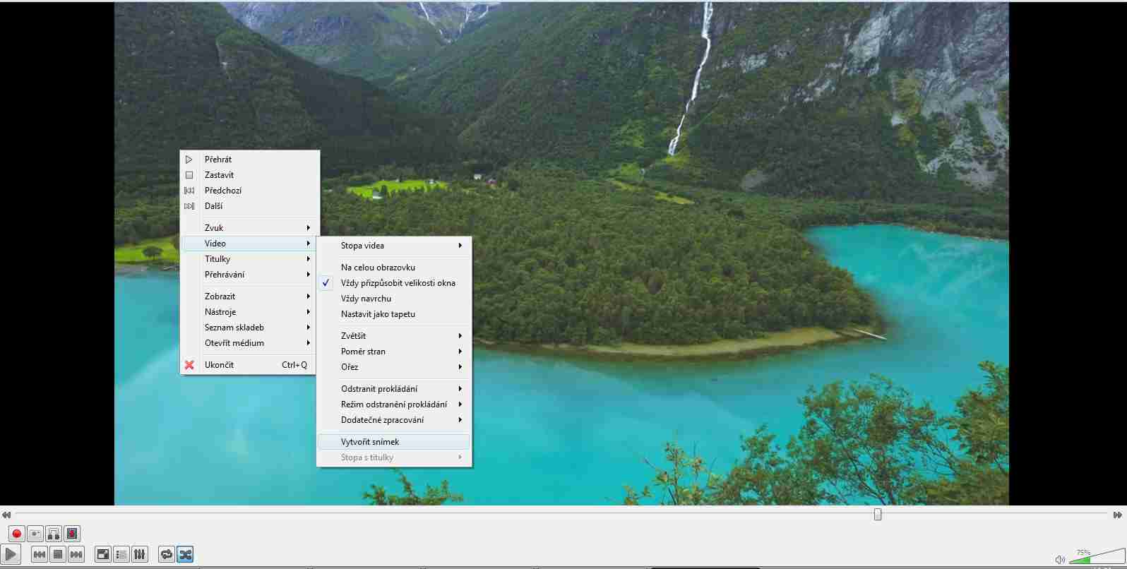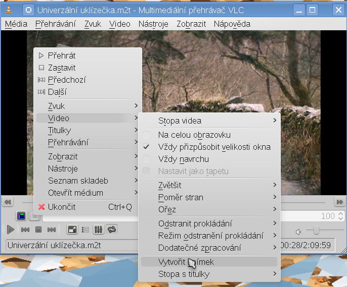 Plovoucí menu > Video > vytvořit snímek Nebo zmíněný SHIFT+S (viz nastavení klávesových zkratek)