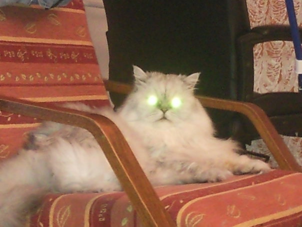 Hledáme doma účinnou a relativně jednoduchou metodu opravy kočičích očí, tedy takovou analogii opravy červených očí u lidí. Foceno bleskem, který sklivec prosvítí až na sítnici. Ve skutečnosti mají být pupily skoro černé.
