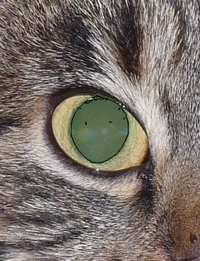 Protože kočičích fotek máme spousty a při "přímém zásahu bleskem" jsou kočičí oči takto zelené, hledáme nějakou pohodlnou obecnou metodu opravy takových snímků.