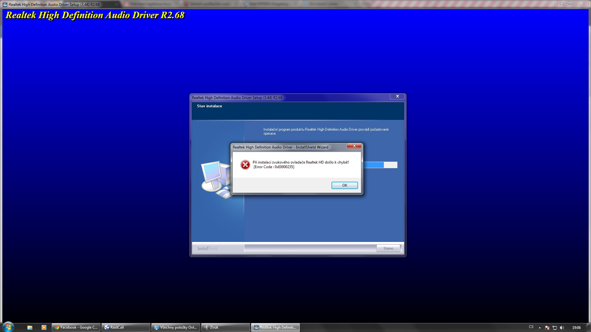 Aby sa vylucila zavada v ovladacoch tak treba skusit nainstalit nacisto Win a len spravne ovladace z webu vyrobcu zakl.dosky (pre dany presny model zakl.dosky) a grafiky, a nie nejake realtek alc z nejakych webov niktonevieskade. Ta chyba pri instalacii moze suvisiet s tym ze instalujes nespravne ovladace (spravne su na webe vyrobcu zakl.dosky). Alebo mas v PC nejake blokovacie programy typu antivir apod tiez mozu robit problemy - skusit ich vypnut pred instalaciou ovladaca.