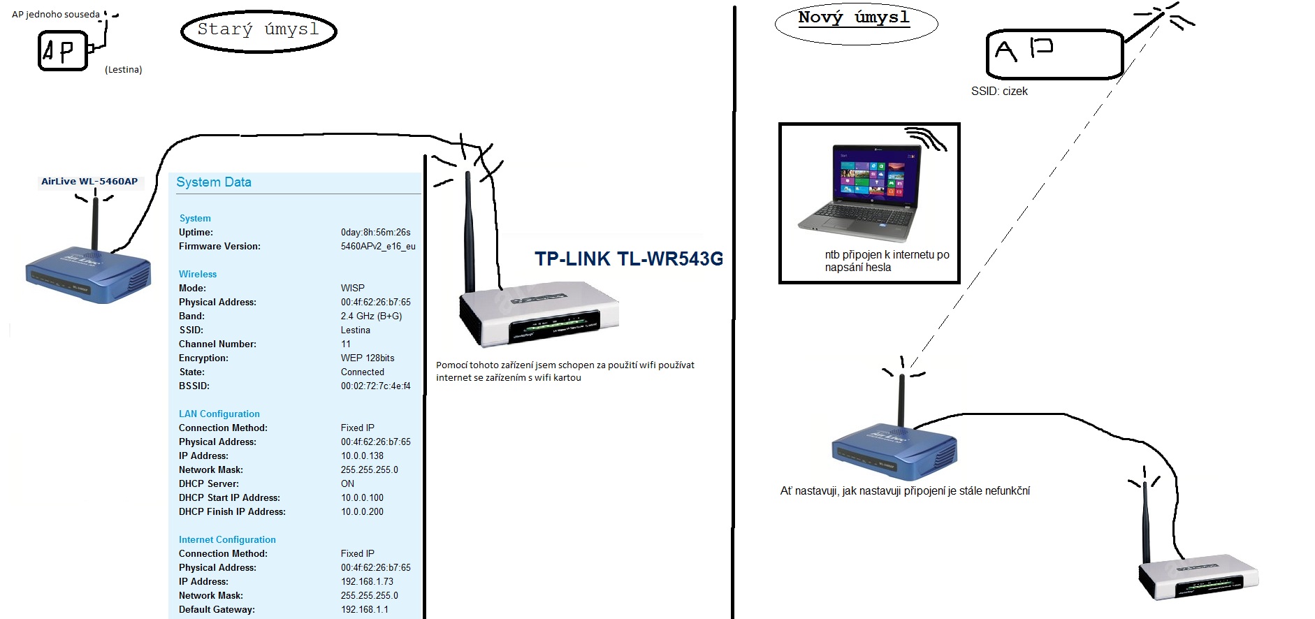 Když k němu příjdu s notebookem, tak se to po zadání hesla normálně připojí, ale když se snažím připojit pomocí wifi krabice na půdě, nastavím režim WISP, vyhledám jeho sít, nastavím režim zabezpečení (WPA2), nastavím heslo dám akceptovat a nic.. Na jiného souseda (zabezpečení "WEP") po zadání hesla vše normálně funguje. Co s tím mám dělat? které informace potřebujete, abyste mi někdo popřípadě pomohl? budu moc vděčný. Půjde to vůbec touhle cestou? Proč na ntb wifi to jde a na krabici ne? DÍKY za pomoc a vysvětlení.