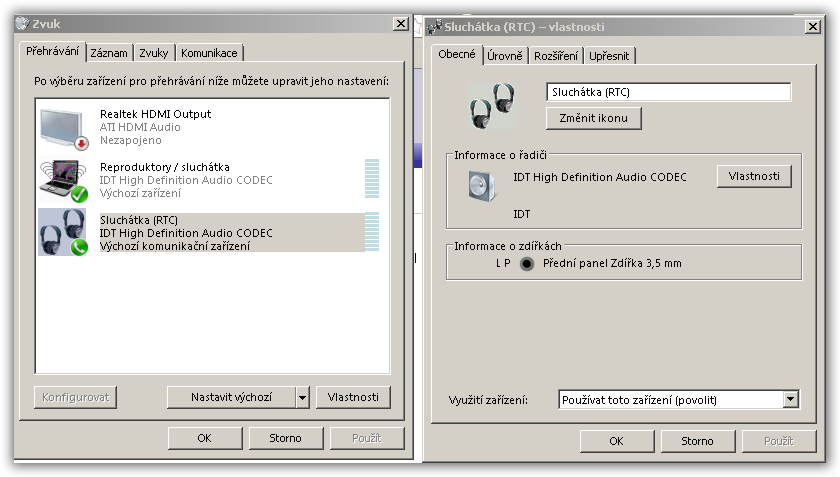 ->Komunikácia slúchadlá (IDT High Definition Audio CODEC)